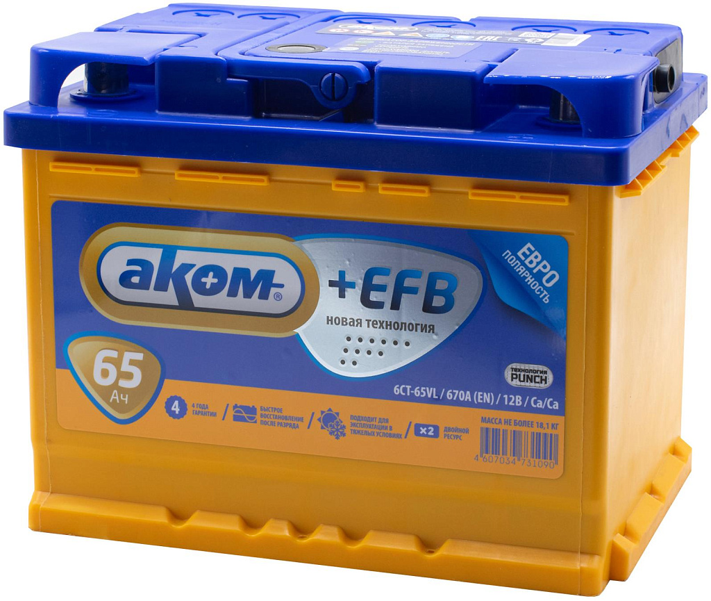 Аккумулятор AKOM +EFB — новейшая разработка завода «Аком» (г. Жигулёвск), созданная с применением технологии EFB. Благодаря усовершенствованной конструкции пластин, технологии PUNCH и улучшенному сепаратору, срок службы увеличен вдвое по сравнению с классическими аккумуляторами.