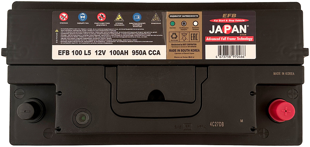 Аккумулятор JAPAN STAR EFB (Enhanced Flooded Battery) — это современная разработка завода BOST CORPORATION (Южная Корея), созданная с использованием запатентованных технологий для автомобилей с системой Start-Stop.