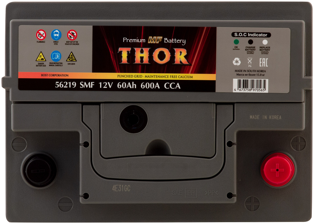 Автомобильный аккумулятор THOR SMF — серия аккумуляторов премиум-класса, выпускаемая заводом BOST CORPORATION (Южная Корея). Производитель применяет запатентованные технологии и материалы высокого качества, обеспечивая стабильную работу и продолжительный срок службы батарей.