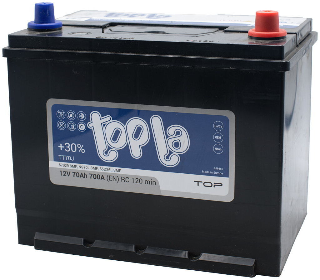 Автомобильный аккумулятор Topla Asia Top (Top Sealed JIS) производится в Словении на заводе концерна TАV (г. Межица). Эта аккумуляторная батарея относится к полностью необслуживаемым и сохраняет стабильные характеристики в течение всего срока эксплуатации.